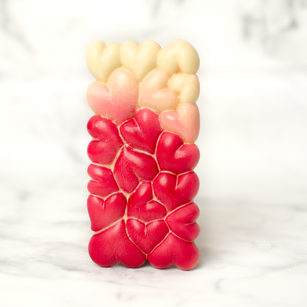 Különleges formájú, apró szívekből összeálló fehércsokoládé tábla, melynek egyik felét piros kakaóvajas festés díszíti. Letisztult, krémes édesség romantikus köntösben, tökéletes Valentin-napi ajándék.